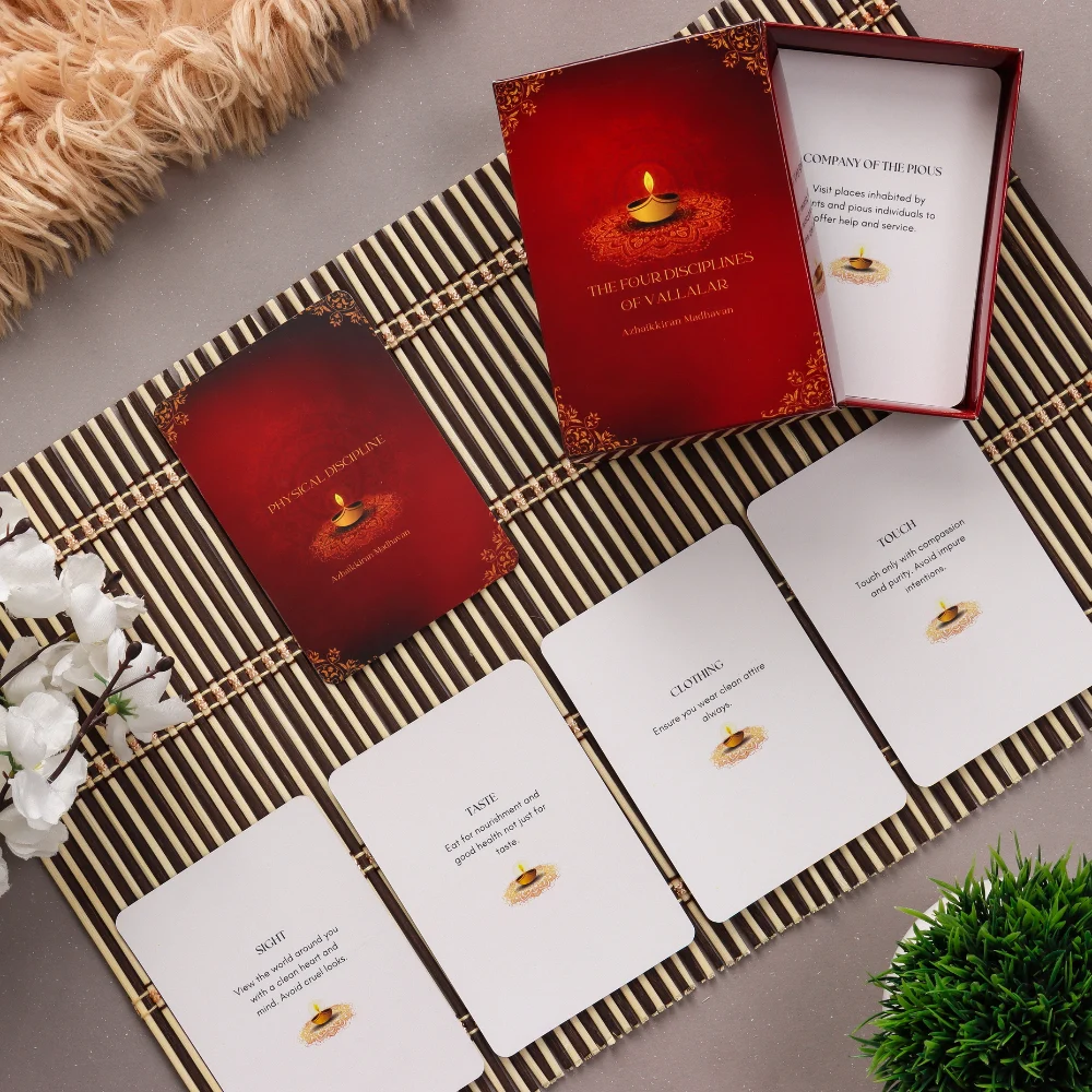 Delve into the timeless wisdom of Vallalar and embark on a journey of self-discovery, inner peace, and spiritual fulfillment with “The Four Disciplines of Vallalar Deck.” Let each card inspire you to embody the teachings of Vallalar, guiding you towards a life of harmony, balance, and profound spiritual awakening.