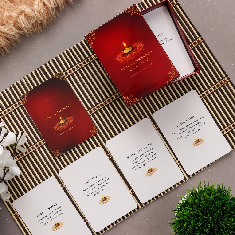 1. Explore Vallalar’s Teachings: Immerse yourself in the wisdom of Vallalar with “The Four Disciplines of Vallalar Deck.” Each card delves into one of the essential disciplines – Physical, Mental, Spiritual, and Soul – offering profound insights and teachings that guide you on a journey of material and spiritual fulfillment.